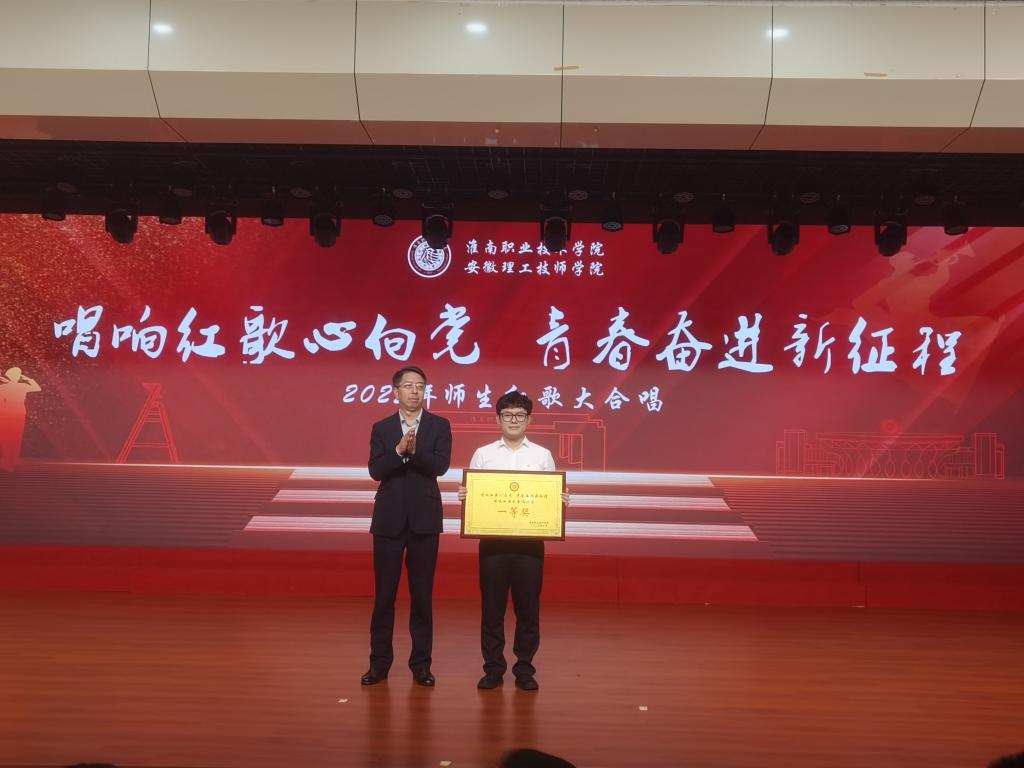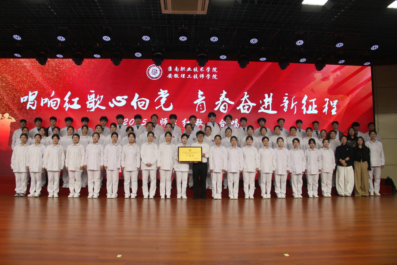 11月7日下午,学校“唱响红歌心向党 青春奋进新征程”师生红歌大合唱比赛在春申湖校区莲花楼大礼堂隆重举行。学校领导班子成员、校长助理、特邀嘉宾评委与近600名师生共同见证了这一盛大赛事。经过激烈角逐,医学院代表队凭借对《没有共产党就没有新中国》与《保卫黄河》两首经典曲目的深情演绎,在九支参赛队伍中脱颖而出,一举夺得比赛桂冠。党委书记、校长袁爱清为医学院代表队颁发一等奖奖牌。