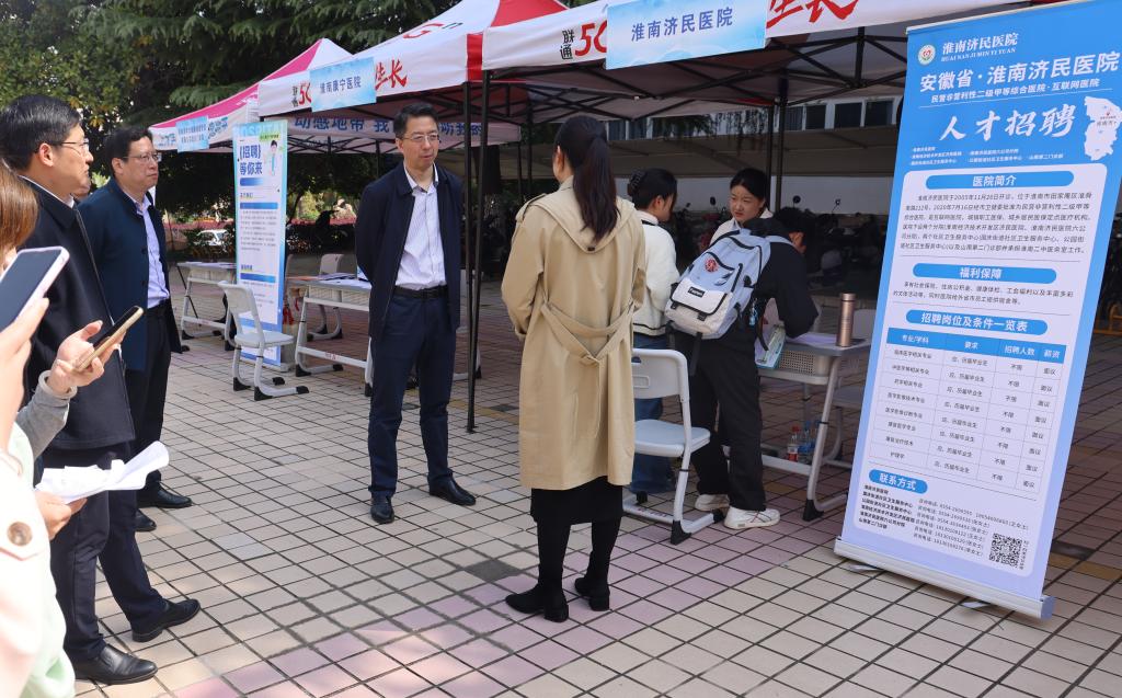 双选会期间,校党委书记、校长袁爱清,校党委副书记、工会主席童喜,副校长胡道成等校领导亲临现场,亲切看望参会单位负责人和求职毕业生。袁爱清与用人单位代表深入交流,详细了解用人需求和对学校人才培养工作的建议。他表示,学校高度重视毕业生就业工作,希望进一步加强与各用人单位的合作,共同探索产教融合、协同育人的新路径,也希望各单位能多带走学校的医药卫生类毕业生,实现校企共赢。